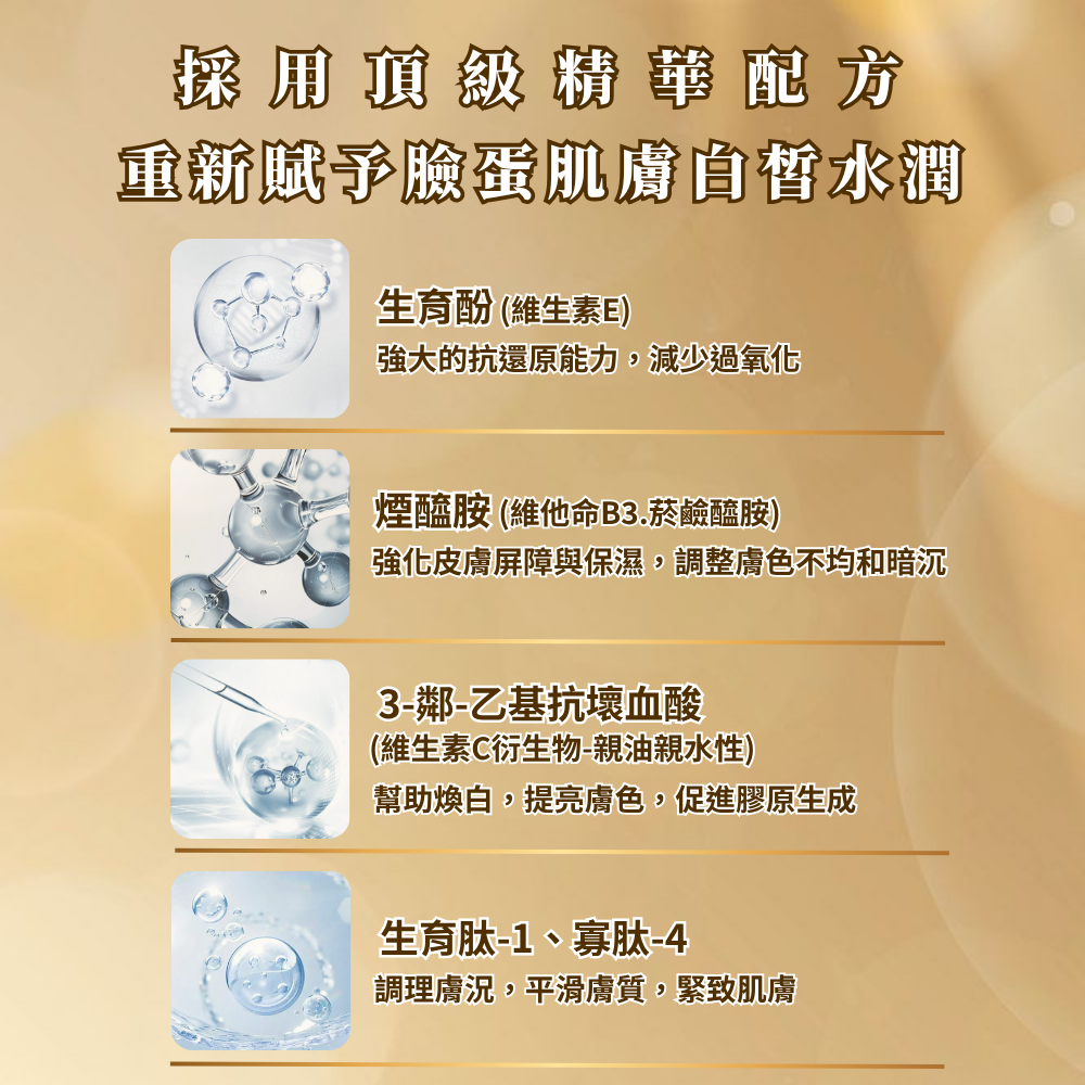 維他命E、煙醯胺、抗壞血酸,潤澤提亮、恢復年輕光澤。